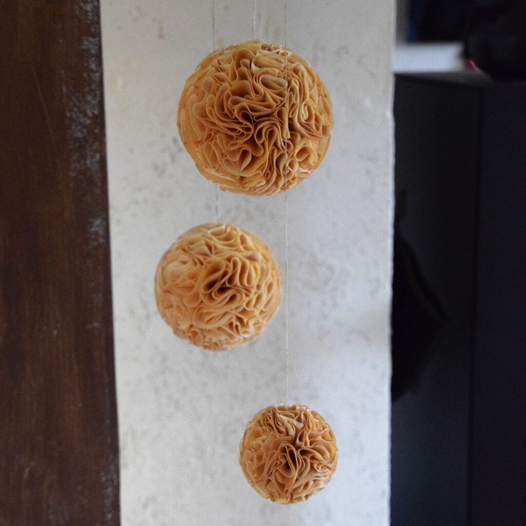 Dazu habe ich mir noch ein Bio-Zirbenöl gekauft und beträufle die Kugeln damit. Das duftet herrlich. Sie hängen in der Nähe meiner Adventsschale in unterschiedlichen Höhen, weit genug weg von meinen Teelichtern damit sie nicht versehentlich in Flammen aufgehen und sind sehr dekorativ! 🙂