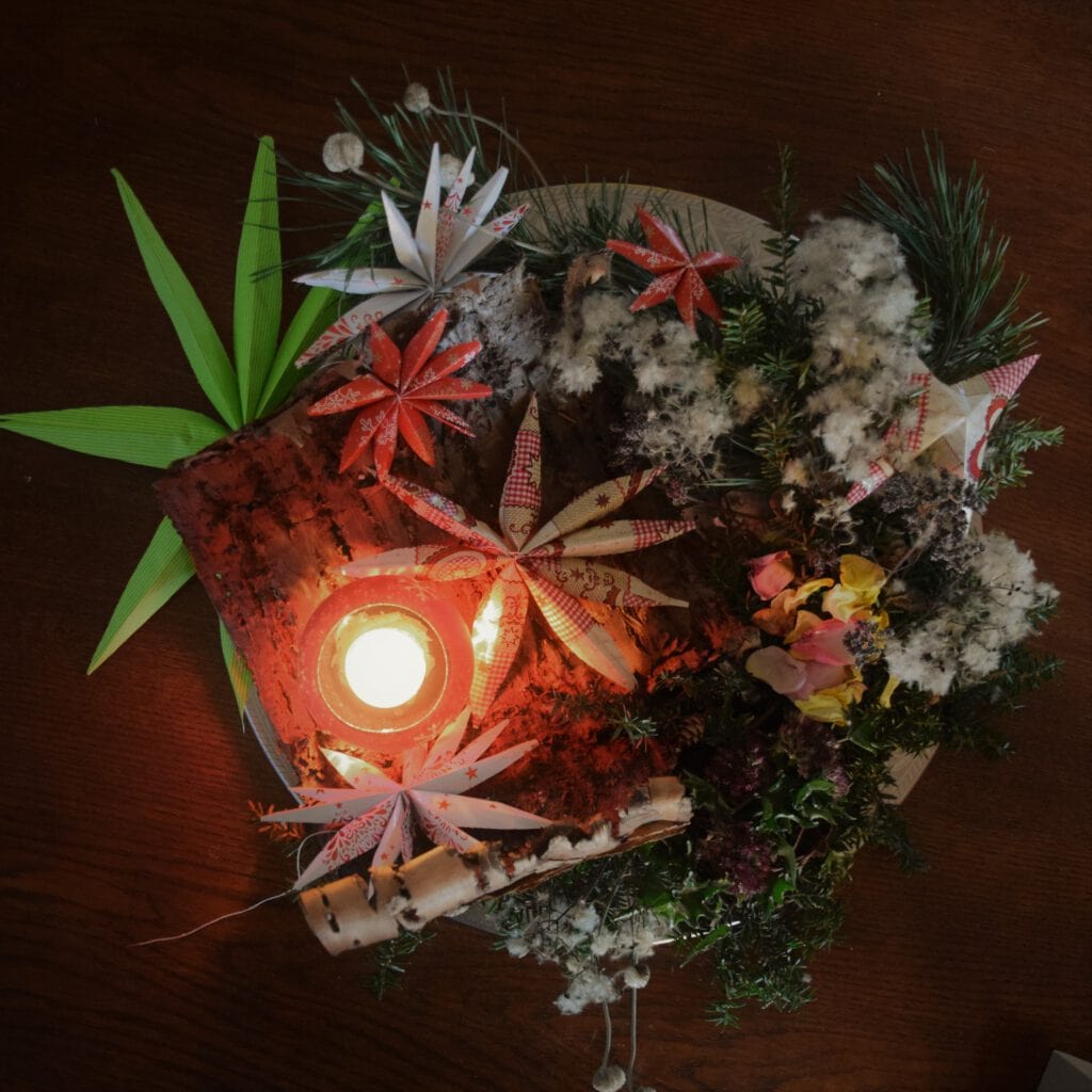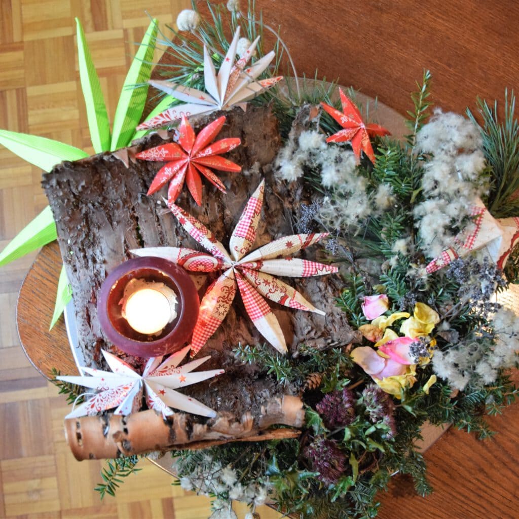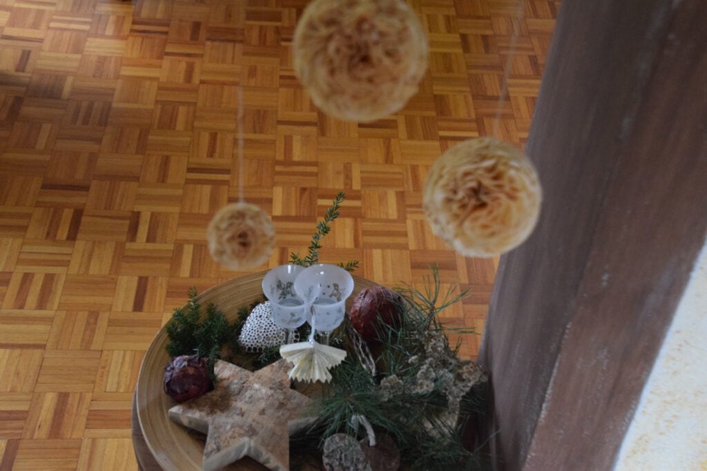 Die Sterne bestehen aus gebrauchtem Geschenkpapier, welches nicht nachhaltig ist, aber verfügbar war. Die Anleitung dazu habe ich bei Instagram gefunden (und leider wieder verloren…), genau das Richtige für mich – ratzfatz und wenig Anspruch 😉